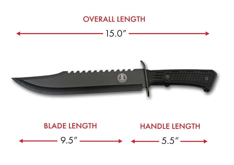 • Dimensions: The overall length is of this hunting knife 15 inches and the handle measure 5.5-inches. The blade is 9.5 inches long, 1.75 inches wide, and 4 mm thick.